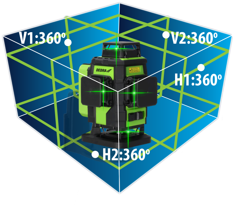 - cztery wiązki laserowe 360° – dwie poziome (górna i dolna) oraz dwie pionowe