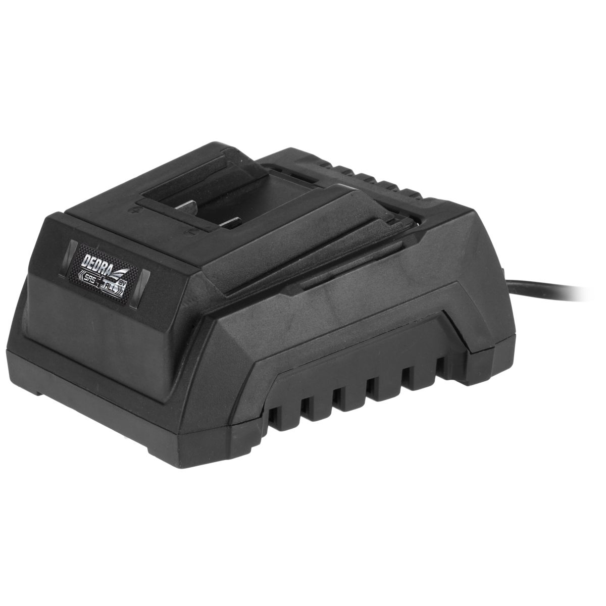 To produkt dedykowany do ładowania baterii z linii SAS+ALL (DED7032, DED7034, DED7035, DED6936, DED6937). Baterię 2.0Ah naładujemy w ciągu 1h, natomiast baterię 4.0Ah w 2h, a 5.0Ah w 2h20min. Ładowarka wyposażona jest w dwie diody: jedna informująca o podłączeniu do sieci, druga informująca o zakończonym procesie ładowania baterii.